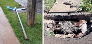 1) Placa derrubada na rua Alcides Ferreira de Andrade, esquina com Manoel Nogueira, no jardim São Francisco de Assis.