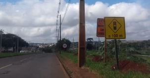 O semáforo (até que enfim) está saindo no trevo de entrada do Lar Paraná, mas as placas sobre o "sinaleiro" estão mirada para o outro lado. A explicação é que também serão instalados semáforos no cruzamento da Miguel Luiz Pereira com a av. Irmãos Pereira, que agora tem prolongamnento que liga bairros novos. A instalação ainda não começou, mas já tem as placas...