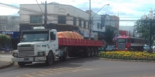 Duas carretas passam, por volta das 14h desta terça-feira, na av. Capitão Índio Bandeira, "centraço" de Campo Mourão. Ivo Quennehem (QI TV)