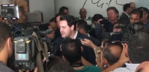 Para conceder entrevista coletiva, no saguão, foi preciso fechar a porta de entrada do teatro.
