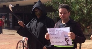 "A morte surda caminha ao meu lado e eu não sei em que esquina ela vai me encontrar". O verso é de Raul Seixas, em "Canto para minha morte", e ilustra bem a cena de mais uma ação do Maio Amarelo, nesta quinta-feira, em Campo Mourão. Por aqui, a morte avisa que não vai trabalhar se você respeitar o trânsito. Nesta sexta-feira tem mais bliz educativa no centro. No domingo as ações serão no Parque do Lago.