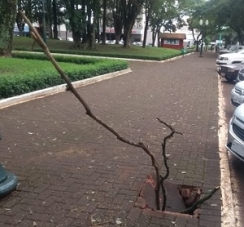 A tampa de concreto quebrou na calçada da av. Irmãos Pereira, em frrente a praça São José, local de grande movimento de pessoas. Uma " boa alma" já deu um jeito de sinalizar o perigo.