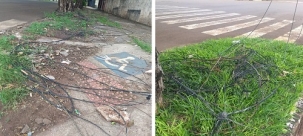 Na av. Irmãos Pereira, esquina com a rua Guarapuava, grande quantidade de fios foi deixada sobre a calçada e o canteiro central. Campo Mourão virou polo brasileiro dos fios sem uso...