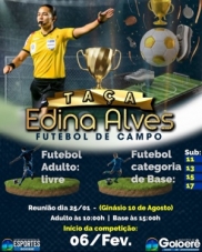 A prefeitura de Goioerê vai promover torneio de futebol com homenagem à árbitra da cidade que ficou famosa em todo o País. Será a Taça Edina Alves, prevista para começar em fevereiro. O torneio terá tanto categoria adulta como de base. Edina é árbitra da Fifa e já apitou jogos em Copa do Mundo Feminina e Olimpíadas.