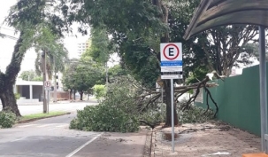 Árvore caída sobre a calçada e parte da av. Goioerê neste domingo à tarde. O muro é do colégio Marechal Rondon.
