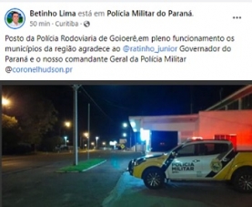 Na postagem, ele disse que prefeitos da região agradecem ao governador e ao comandante geral da PM.