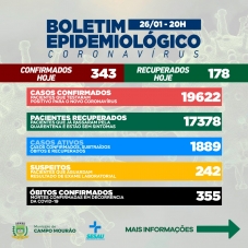Novo recorde de casos de covid-19 confirmados num único dia em Campo Mourão. Foram 343 nesta quarta-feira. O número de casos ativos subiu para 1.889. Também foram confirmadas duas mortes - homem de 60 e mulher de 88 anos. Agora são três óbitos em janeiro. A taxa de ocupação de leitos está em 87% na enfermaria e 60% na UTI SUS.