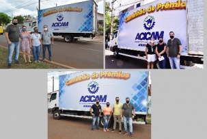 A Acicam entregou nesta quarta-feira as três mobílias residenciais sorteadas na campanha “Campo Mourão Cidade Natal/2021”. Foi um caminhão de prêmio para cada sorteada - Rosimar Brandão Narcíso, Vanessa Vito e Maria Aparecida Ceccato. Nesta quinta-feira (9h30) será entregue o carro 0 km a Amadeu Sprengoski.