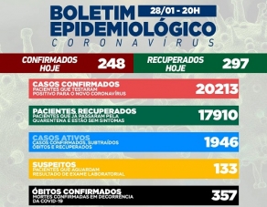 Menos casos - O boletim desta sexta-feira trouxe um número menor de casos confirmados: 248 (foram 343 nos dois dias anteriores). Os recuperados foram 297. Assim, o número de casos ativos caiu um pouco: 1.946.
