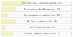 "Você acha certo iniciar aulas presenciais com a pandemia batendo recorde de novos casos de covid-19?" Enquete foi encerrada neste domingo. Venceu a alternativa "Sim. A maioiria das pessoas já está vacinada", om 34% dos votos. "Não. Deveriam adiar este início" teve 19% e "Não. As crianças não estão vacinadas" 18%. As alternativas "sim" tiveram 49% e as "não" 51% dos votos. O resultado completo está no quadro acima.
