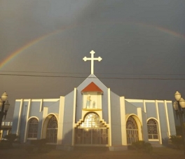 Igreja Nossa Senhora de Caravaggio, no Lar Paraná, com o arco-íris deste domingo.