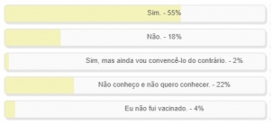 "Você conhece alguém que não quis se vacinar (e não se vacinou) contra covid-19?" Enquete com essa pergunta foi encerrada neste domingo. Venceu a alternativa "Sim", com 55% dos votos. "Não conheço e não quero conhecer" ficou em segundo, com 22%. Outros 18% foram no "Não". Já a alternativa "Eu não fui vacinado" teve 4% dos votos. O resultado completo está no quadro acima.