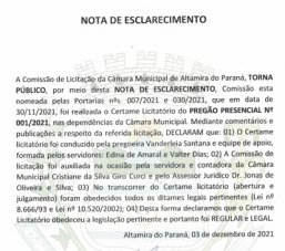 A Comissão de Licitação da Câmara de Altamira do Paraná emitiu "Nota de esclarecimento" nesta sexta-feira. Diz que o pregão presencial 001/2021 seguiu todos os trâmites legais e que, portanto, o certame foi regular e legal (veja acima).