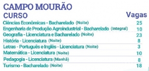 A Unespar abriu inscrições para o Vestibular Especial 2022. O objetivo é preencher vagas que restaram do processo seletivo anterior. No câmpus de Campo Mourão são 105 vagas em oito cursos (veja quadro acima). Será apenas uma prova de redação a ser aplicada no dia 6 de fevereiro. Interessados têm até dia 17 de janeiro para se inscreverem.