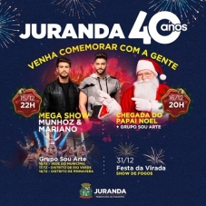 Juranda completa 40 anos de emancipação política nesta quinta-feira. Para comemorar, tem show na praça. A atração será a dupla Munhoz & Mariano (aquela, do "Camaro amarelo!"). A programação segue com a chegada do Papai Noel na cidade e nos distritos de Rio Verde e Primavera. A prefeita Leila Amadei confirmou para o dia 31 a queima de fogos e o show da virada em praça pública.