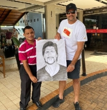 O cantor Léo Chaves (aquele, da dupla com o irmão Vitor) esteve em Campo Mourão neste sábado. Claro: teve de fazer uma "fotinha" básica com o "recepcionista oficial" da cidade, Magnum Alves. De quebra, ganhou o desenho de seu retrato feito pelo próprio Magnum. É a vida voltando ao normal e o trabalho do "recepcionista" também...