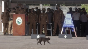 Parece música antiga dos Secos & Molhados, mas ao invés da estrada o gato preto cruzou, nesta quarta-feira, o batalhão. Foi na solenidade de troca de comando do 11.o BPM de Campo Mourão. Coincidência ou não, depois que o gato preto apareceu o microfone começou a falhar e deu "pane" no notebook do cerimonial... (Foto: Dirceu Portugal)