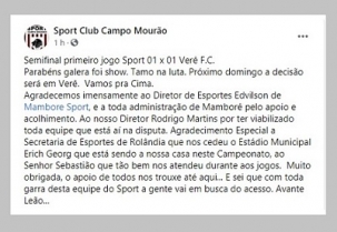 Após o empate com o Verê, nesta quarta-feira, pelas semifinais da Terceirona, o Sport Club Campo Mourão usou as redes sociais para agradecimentos. Agradeceu a administração de Mamborê, "pelo apoio e acolhimento". E a Secretaria de Esportes de Rolândia "que nos cedeu o Estádio Municipal Erich Georg, que está sendo a nossa casa neste Campeonato". Hummmmm...