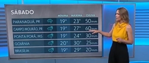 Tem gente na Globo que gosta de Campo Mourão. Nesta sexta-feira, em pleno Jornal Nacional, saiu de novo a previsão do tempo para sábado para a a terra do carneiro no buraco. E olha que o Brasil tem mais de 5.500 cidades. Segudo o JN, vai chover 60 milímetros e a temperatura variar de 19 a 27 graus.