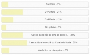 "A essa altura tomo até da Coreia do Norte" foi a alternativa mais votada em enquete encerrada neste domingo. Teve 25% dos votos. "Cavalo dado não se olha os dentes" e a de "Oxord" empataram na segunda posição, com 21%. Outros 12% foram na alternativa da "Rússia" e 8% ainda preferem ficar na cloroquina. O resultado completo está no quadro acima.