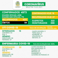 Boletim covid desta segunda-feira trouxe a confirmação da 94ª morte em Campo Mourão. Outro ponto negativo: a enfermaria covid está com todos os leitos ocupados, Na UTI o índice é de 91%. Mais notícia ruim: os casos suspeitos ficaram, de novo, acima dos 300. De positivo, o número de novos casos abaixo da média (16).
