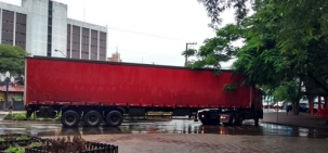 Na manhã desta sexta-feira, carreta fica "enroscada" no calçadão e provoca engarrafamento no centro de Campo Mourão.