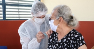 Nilza Nascimento, de 93 anos, primeira moradora de Campo Mourão a ser vacinada contra a covid-19, nesta terça-feira, quando a vacina começou a ser aplicada para maiores de 90 anos. Pelo cadastro da Saúde, Campo Mourão tem 429 nonagenários.