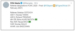 A árbitra Edna Alves, de Goioerê, foi escalada para trabalhar na decisão do Mundial de Clubes da Fifa. Será a quarta árbitra. O juiz central vai ser o uruguaio Esteban Ostojich. A final entre Bayern (Alemanha) e Tigres (México) acontece nesta quinta-feira (15h), no Catar. Edna já foi a quarta árbitra no jogo Tigres 2 x 1 Ulsan e a árbitra central na decisão do quinto lugar - Al Duhail 3 x 1 Ulsan.