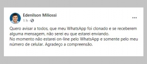 Mais um prefeito da região teve o Whatsapp clonado. A vítima agora foi Edenilson Miliossi, de Barbosa Ferraz. Ele comunicou o caso em postagem em redes sociais. "Se receberem alguma mensagem, não serei eu que estarei enviando", explicou.