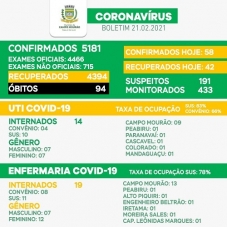 Boletim Covid desde domingo trouxe a confirmação de mais 58 casos em Campo Mourão. Bem acima da média do mês (28,6). O número de suspeitos caiu para 191. Em compensação o índice de ocupação na UTI subiu de 66% para 83%. Ao todo, 33 pessos estão internadas na ala covid, sendo 14 na unidade de terapia intensiva.