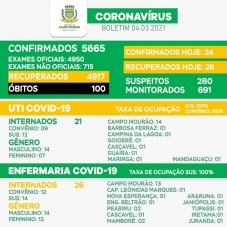 O boletim desta quinta-feira trouxe a confirmação de mais 24 casos de covid-19 em Campo Mourão. Foi o dia que a cidade chegou à triste marca de 100 mortes causadas pelo coronavírus. Morrerm uma mulher de 67 e um homem de 82 anos. Na ala covid da Santa Casa tudo lotado, com direito a superlotação na UTI/Convênios.