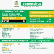 O boletim desta sexta-feira trouxe a confirmação de mais 21 casos de covid-19 em Campo Mourão. Ficou abaixo da média desta vez. Os recuperados foram 32. Mas há 238 casos suspeitos. O índice de ocupação da UTI/SUS subiu para 91%. Na UTI/convênios se manteve em 100% e na enfermaria caiu para 85%.