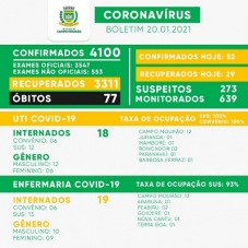 A vacinação começou, mas os casos de covid-19 não param. Nesta quarta-feira foram mais 52 confirmações em Campo Mourão. O número de mourãoenses com o vírus ativo passou de 700 (são 712). Dezoito pessoas estão internadas na UTI, que segue lotada tanto no SUS como nos convênios. Na enfermaria são 19 os leitos ocupados (93%).
