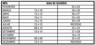 Definido o calendário das sessões ordinárias deste ano da Câmara de Campo Mourão. Serão 36 reuniões. As primeiras acontecem dias 22 e 23 de fevereiro e as últimas 13 e 14 de dezembro. Serão sempre às 19h. Está mantido o recesso na segunda quinzena de julho. Além disso, podem ser marcadas sessões extraordinárias e solenes, além de audiências públicas.
