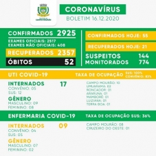 De cada 100 moradores de Campo Mourão, três já tiveram covid-19. Nesta quarta-feira foram mais 55 casos confirmados, elevando o total para 2.925. Hoje existem 516 mourãoenses com o vírus ativo. Dez estão na UTI. A unidade de terapia intensiva da Santa Casa, aliás, segue com 100% de ocupação entre os leitos do SUS. Nos leitos de convênios o índice também é alto: 83% e apenas uma vaga disponível.