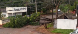 Árvore caiu durante a chuva desta quarta-feira e fechou a rua em frente à Aracampo, em Campo Mourão. Moradores reclamaram que, já que não era possível retirar a árvore de imediato, que o local deveria ter sido sinalizado, uma vez que era perto de uma esquina, com riscos de acidentes. Um morador colocou uma fita de sinalização.