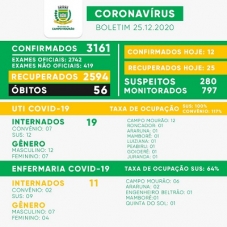 Doze casos de covid-19 foram confirmados nesta sexta-feira de Natal em Campo Mourão. Houve mais recuperados (25) e o número de mourãoenses com o virus ativos caiu par a 511. A ala covid da Santa Casa está com 30 pessoas internadas - 19 na UTI e 11 na enfermaria. A unidade de terapia intensiva voltou a lotar entre os leitos do SUS (100% de ocupação) e segue superlotada entre os leitos de convênios (117%).