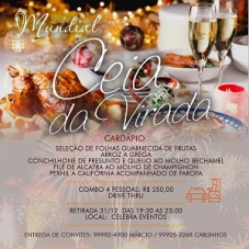 Depois da ceia de Natal, vem aí a "ceia da virada drive thru" em Campo Mourão. É mais uma promoção do buffet Mundial. O combo para quatro pesosas custa R$ 250 e deve ser retirado no Celebra, quinta-feira, das 19h30 às 23h. O cardápio inclui seleção de folhas guarnecida de frutas, arroz à grega, colchilhone de presunto e queijo ao molho bechamel, filé de alcatra ao molho champignon e pernil à califórnia acompanhado de farofa.