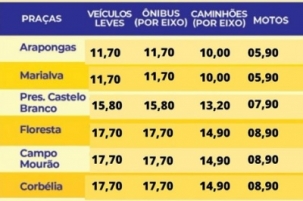 Tem reajuste das tarifas do pedágio a partir da 0h desta terça-feira. Na praça entre Campo Mourão e Mamborê (BR-369) e Campo Mourão e Maringá (PR-317) a tarifa para carros de passeio sobe de R$ 16,30 para R$ 17,70. Ou seja, aumentinho de cerca de 8,5%. Segundo a Viapar, o reajuste está previsto no contrato de concessão.