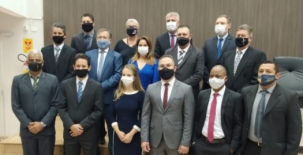 Pose para a foto oficial da posse nesta sexta-feira em Campo Mourão. O prefeito Tauillo Tezelli, a vice-prefeita Fátima Nunes e os 13 vereadores. Todo mundo de máscara, mas o decreto em vigor proíbe eventos com mais de 10 pessoas, não proíbe? Aí deu 15. Mas quem vai multar se o secretário da Fiscalização, Cristiano Calixto, pediu demissão na quarta-feira?...