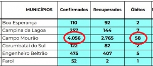 Boletim da prefeitura, de sexta-feira, mostra Campo Mourão, com 3.819 casos de covid-19 desde o início da pandemia.