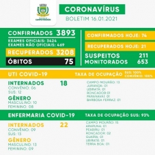 Mais 74 casos de covid-19 foram confirmados neste sábado em Campo Mourão. O número de mourãoenses com o vírus ativo voltou a passar dos 600 (agora são 610). Há 40 pessoas internadas na ala covid da Santa Casa, sendo 28 de Campo Mourão. A UTI está com todos os leitos ocupados e a enfermaria com índice de 93%.