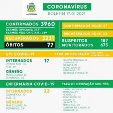 Boletim covid deste domingo trouxe a confirmação de mais 67 casos em Campo Mourão. O número de mourãoenses com o vírus ativo chegou a 652. A média móvel de novos casos este ano está em 38,3. O domingo teve inda mais duas mortes e agora são 12 somente em janeiro. A UTI está com 100% dos leitos do SUS ocupados e a enfermaria com 93%.