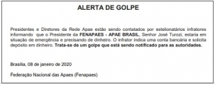 A Federação Nacional das Apaes divulgou "Alerta de golpe" nesta quarta-feira. Diz que presidentes e diretores de Apaes estão sendo contatados por pessoas informando que o presidente da federação estaria em situação de emergência e precisando de dinheiro. O presidente, no caso, é o mourãoense José Turozi. Só que é mentira. É golpe. É estelionato.