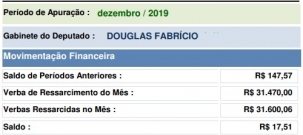 O gabinete do deputado Douglas Fabrício terminou 2019 com R$ 17,51 de sobras nas verbas de ressarcimentos.