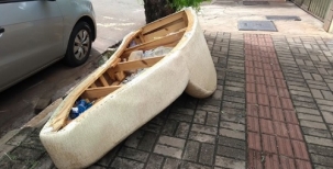 É um sofá? É um bote? Seja lá o que for, foi deixado em calçada na rua Araruna, centro de Campo Mourão.