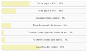 Pagar o IPVA terminou em terceiro (15%) e fugir do mosquito da dengue em quarto (10%).