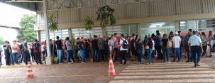 "Pessoas formando fila na Ciretran de Campo Mourão, nesta terça-feira, ao lado de fora para evitar aglomeração em ambiente fechado. Medidas sendo tomadas para evitar o coronavírus".
