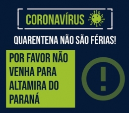 Em Altamira do Paraná tem até campanha para que ninguém vá à cidade. "Quarentena não são férias. Por favor, não venha a Altamira do Paraná", destaca. A preocupação é com pessoas de outros municípios que estão indo visitar parentes e amigos. Pelo decreto da prefeita Elza A. Silva, desde às 6h deste sábado começou um monitoramento nas entradas de Altamira. Quem chega tem de responder a um questionário.