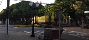 Carreta cruza av. Capitão Indio Bandeira, pela rua Harrison José Borges, na manhã desta quinta-feira. Nem o coronavírus tira as carretas do centro de Campo Mourão.